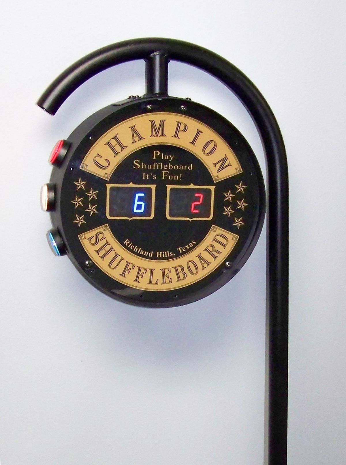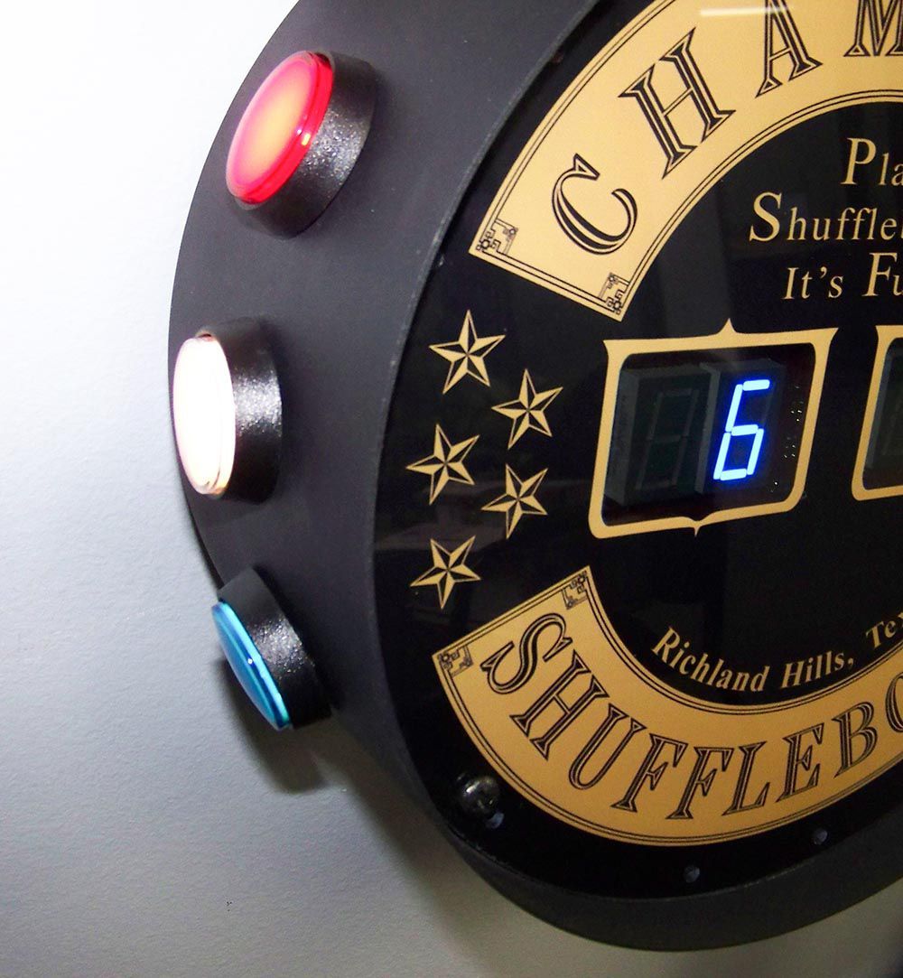 Playing Table Shuffleboard is much more engaging with an electronic scoreboard. The J-Bar is our best selling Champion Shuffleboard brand residential-use scoreboard. It features a double sided display and comes standard with a single set of scoring buttons, which are located on the head of the scoreboard. The optional External Button Boxes can be added, if you prefer to have scoring buttons mounted at both ends of your Shuffleboard Table. The J-Bar comes in a super durable black metal, powdered coated cabinet. Like all products offered by The Shuffleboard Federation, the J-Bar is made in the USA.