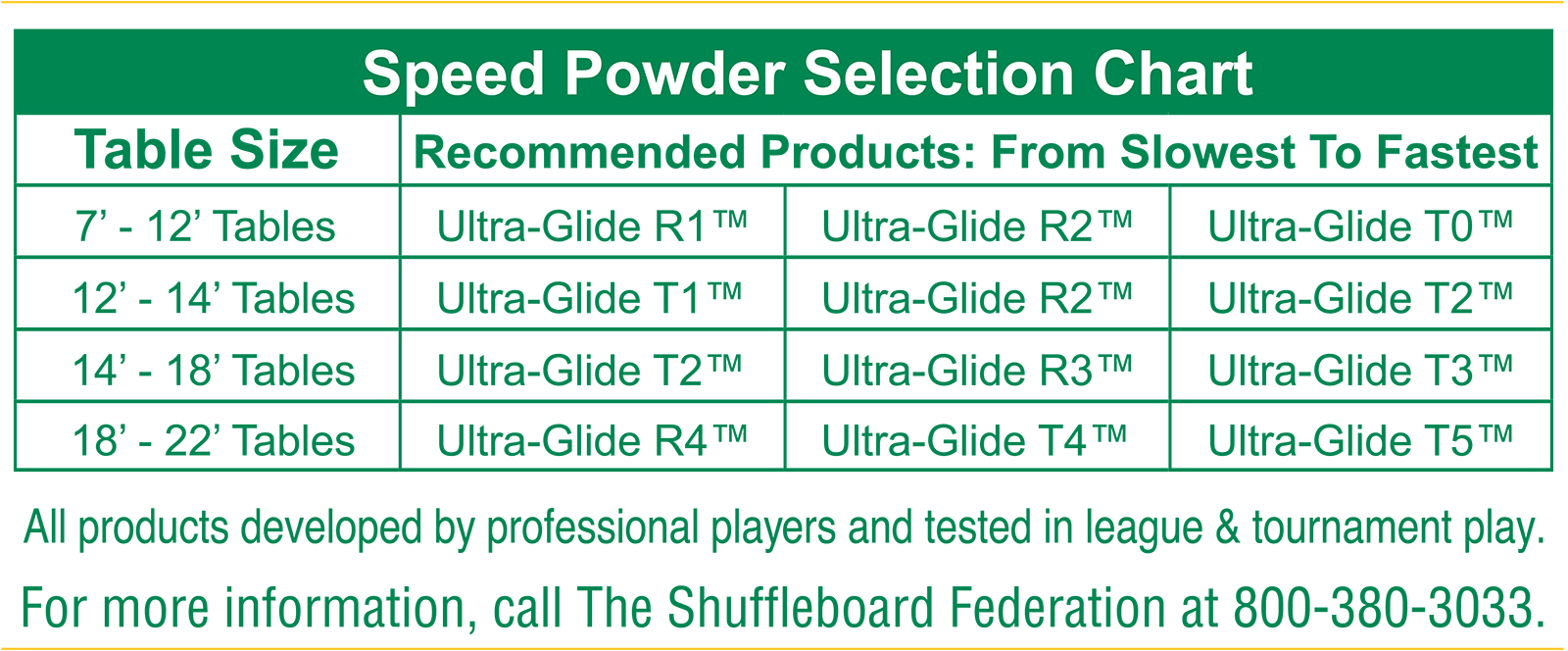 Please use our Shuffleboard Table Speed Powder Selection Chart to determine which of our speed powder options is right for you.